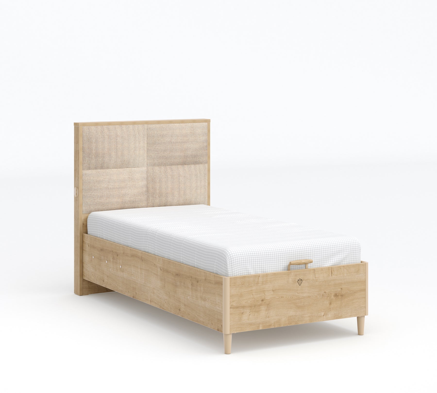 The Mocha Upholstered Bed Base offers an elegant alternative to the Mocha series with its simple design and functional details. Its upholstered headboard creates a warm and comfortable atmosphere in the bedroom. Oak-colored plastic pieces are used in the footboard corner details, while natural wood is used in the base handle.