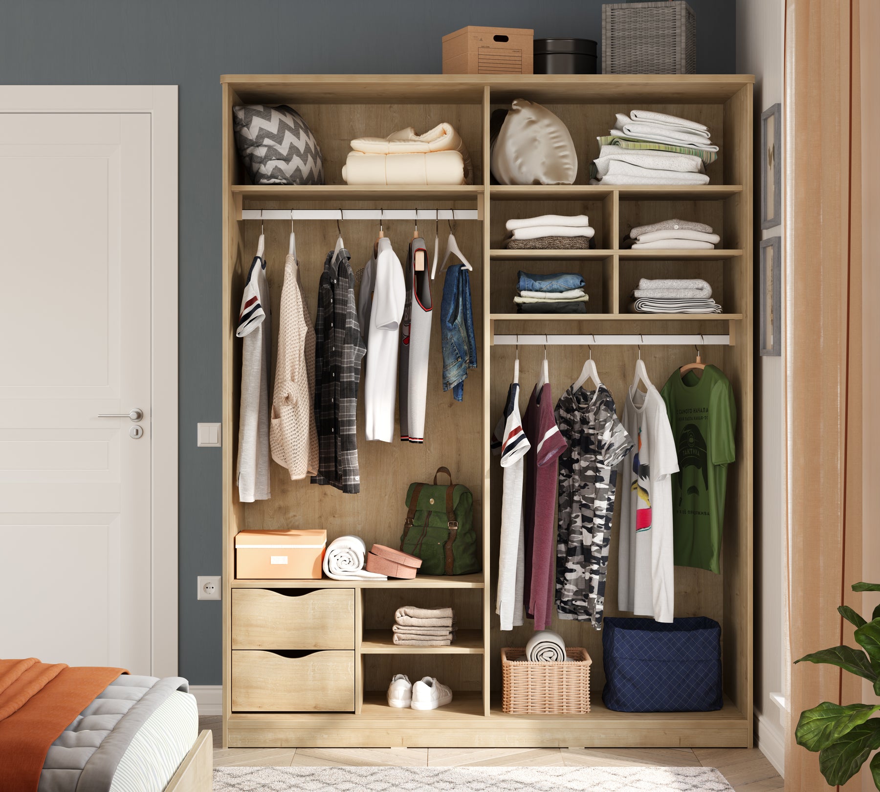 Its interior design features two hanging areas, numerous shelves, and convenient drawers, offering organized storage for everything from clothes to accessories. The tandem-rail drawers on the left provide easy and quiet operation, while the wheeled system and soft-closing plastics on the sliding doors offer a long-lasting and comfortable experience.