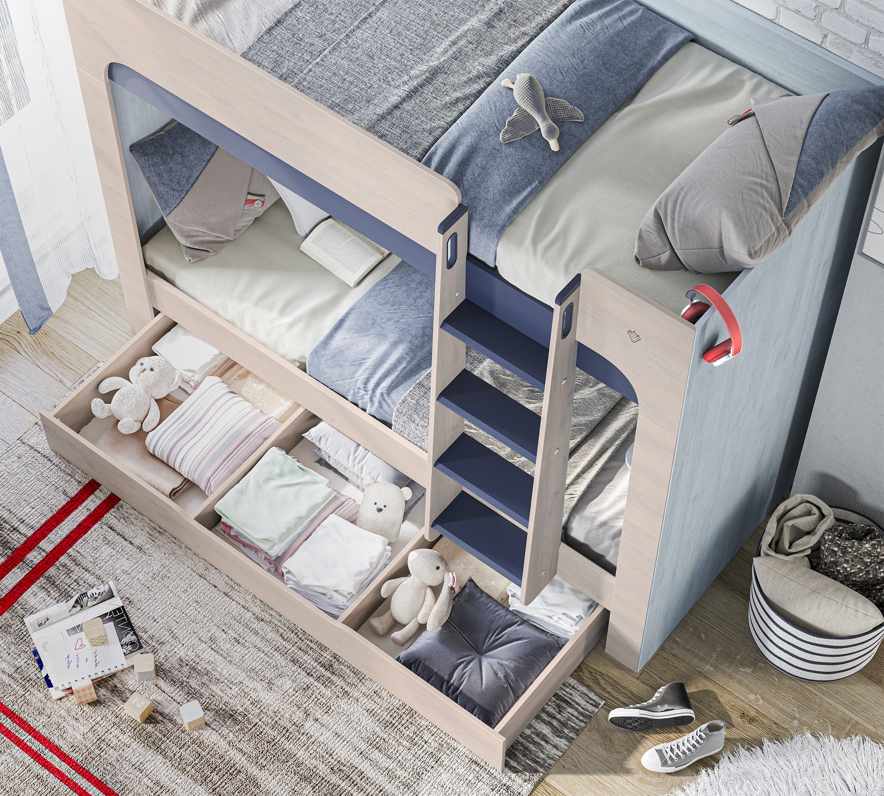 The dark blue embossed paint technique used on the stair treads provides safe use by preventing slipping thanks to its rough surface. The bunk bed structure integrates with the energizing blue tones and warm wood texture of the Trio series, creating a dynamic and modern atmosphere in the room.