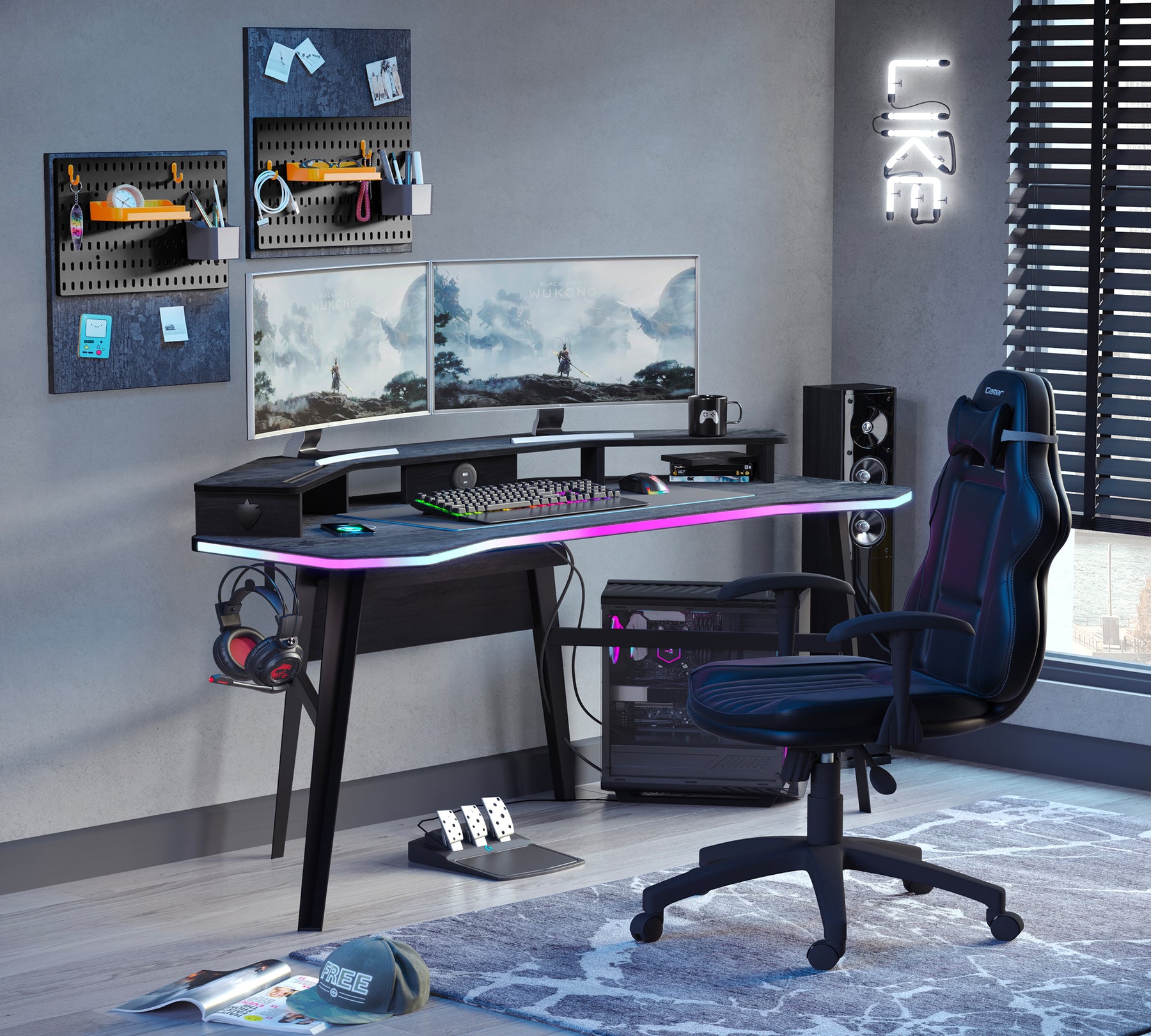 Remote-controlled RGB LED lighting located on the front of the side panels adds energy and style to the gaming area, while the dedicated compartment under the desk offers an ideal solution for computer case placement.