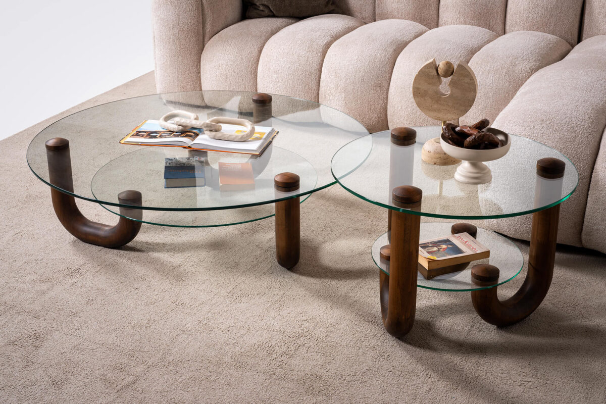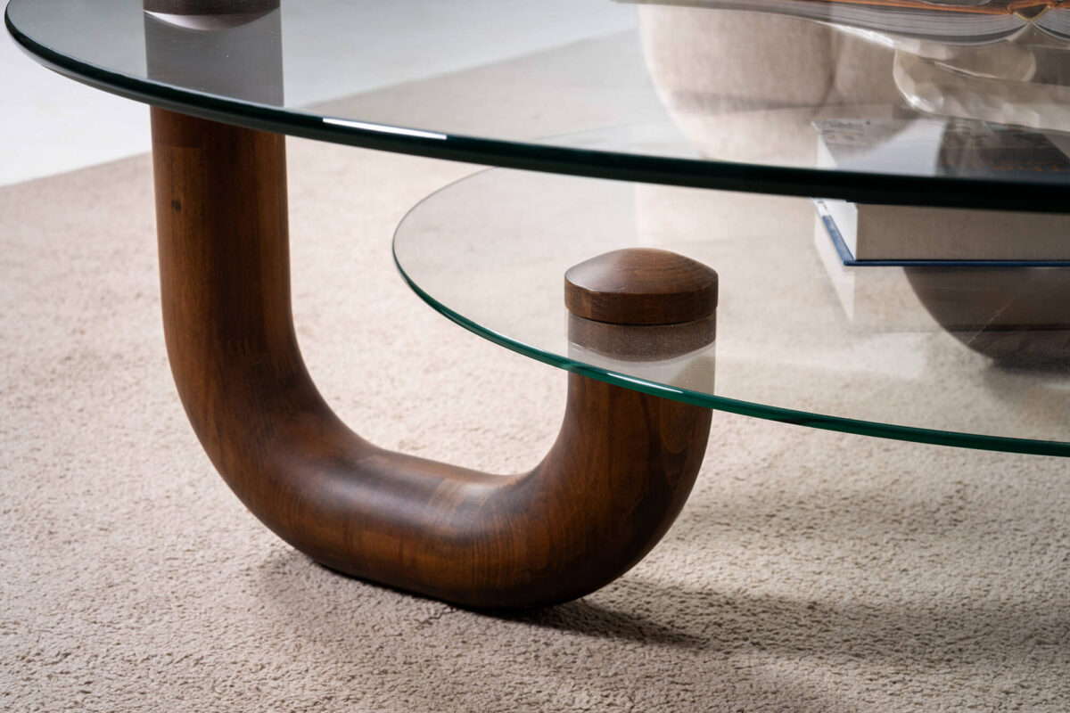 Top and bottom table are transparent glass / Beech panel legs. |