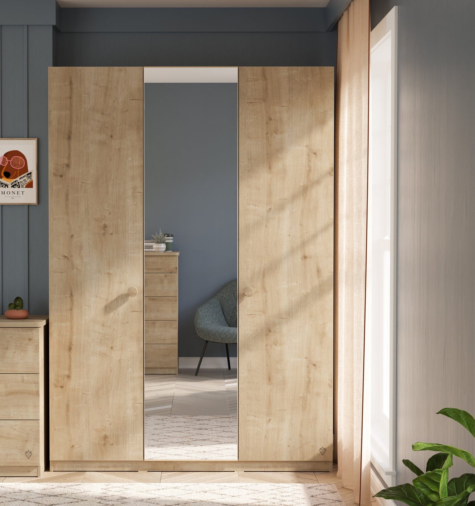 Featuring natural and modern lines , the Mocha 3-Door Mirrored Wardrobe offers both style and functionality. The large mirror on the middle door adds a sense of spaciousness and openness to your room while making your daily preparations more practical.