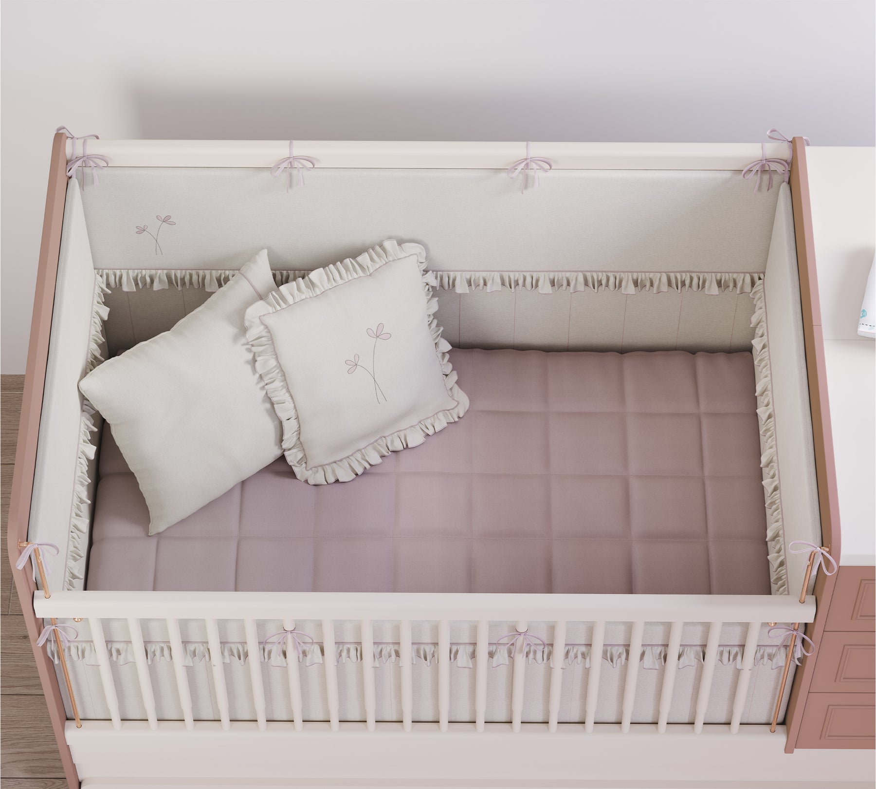 The Rossy Sleep Set, consisting of a duvet, headboard, footboard and backboard, pillowcase, and fitted sheet, creates a pleasant sleeping environment for babies. Its cotton construction ensures a soft and breathable feel. It is adorned with embroidered details and trims. It has a simple and minimalist design. Thanks to its high-quality workmanship, it is extremely durable.